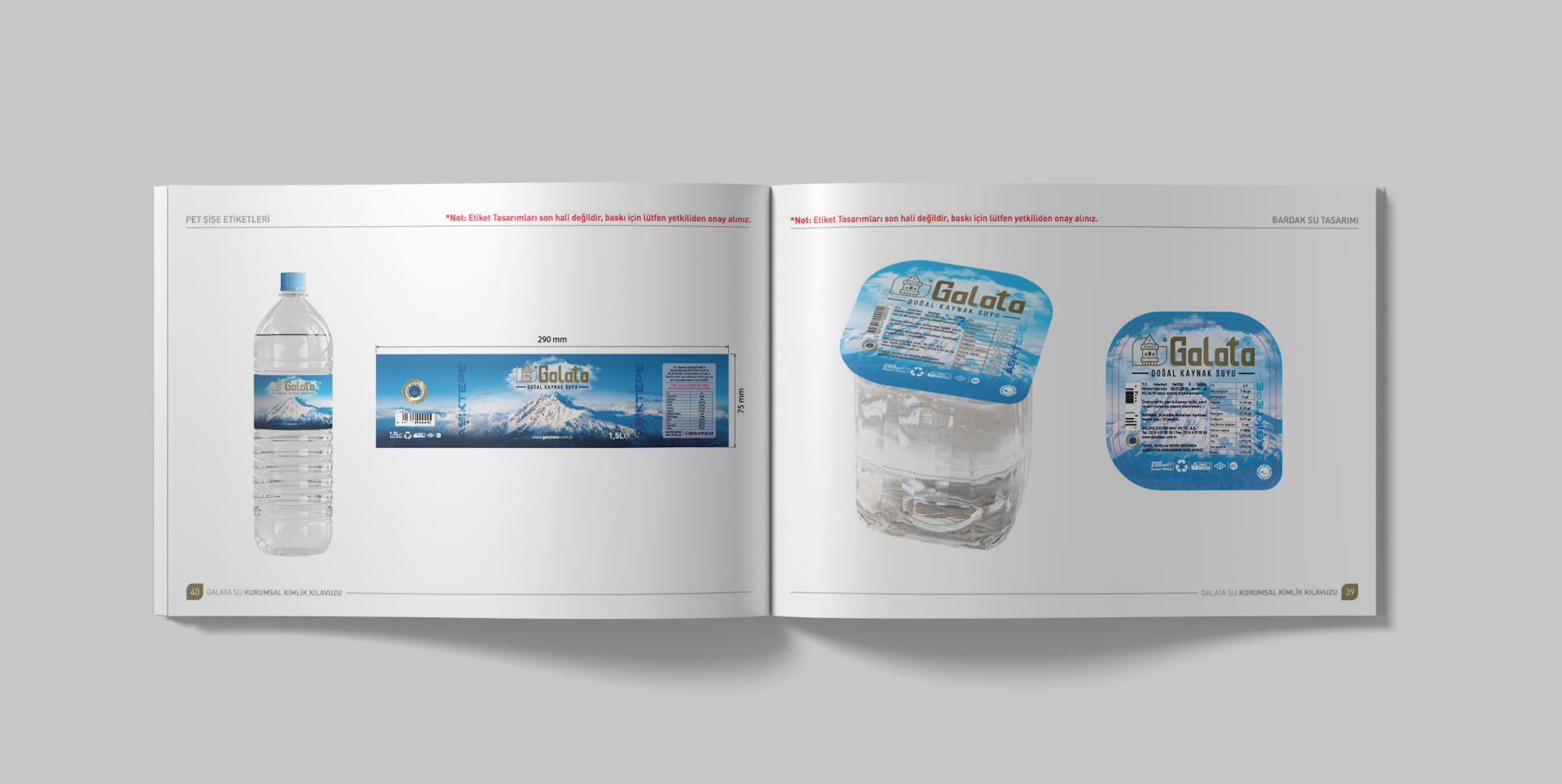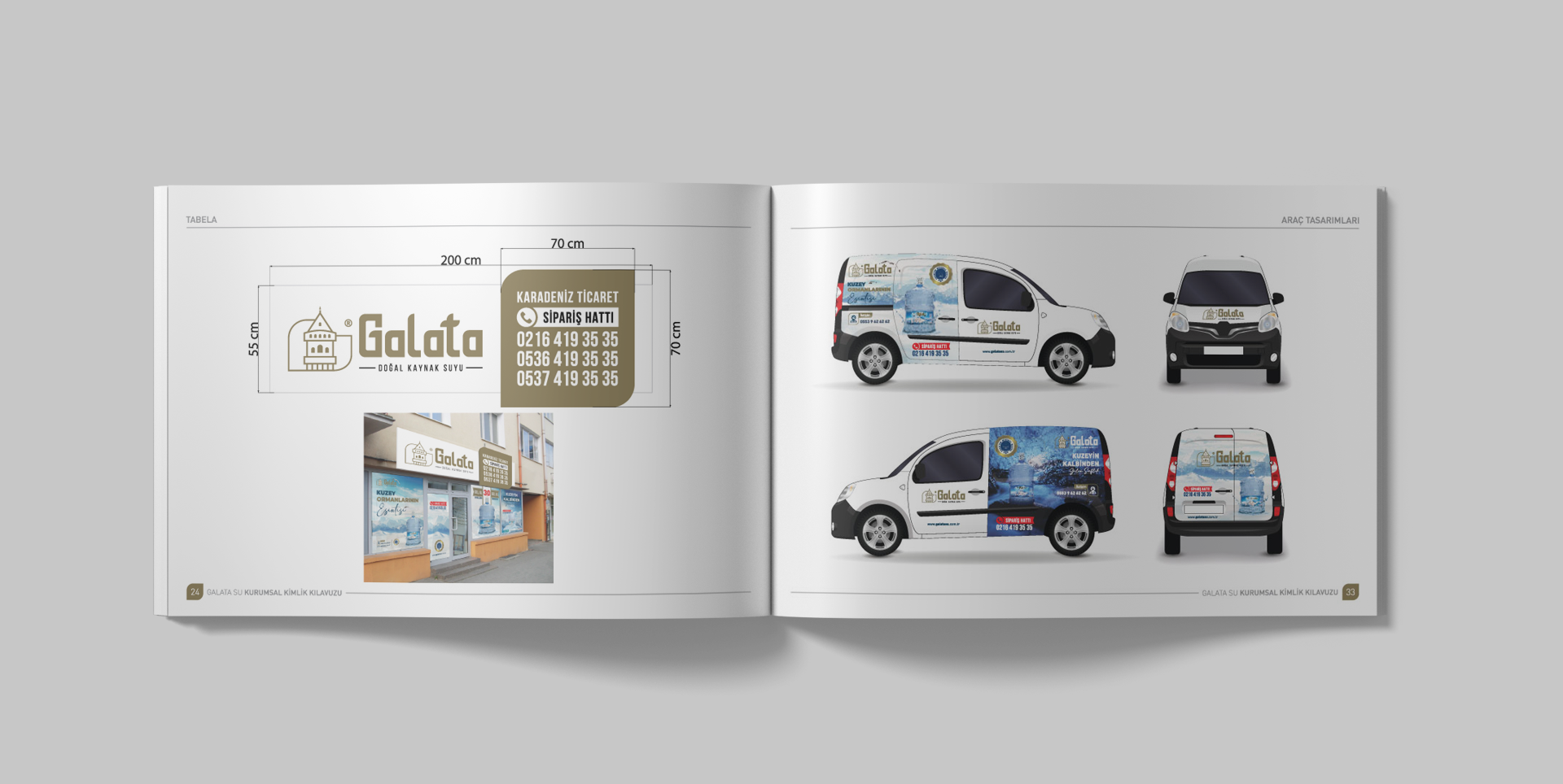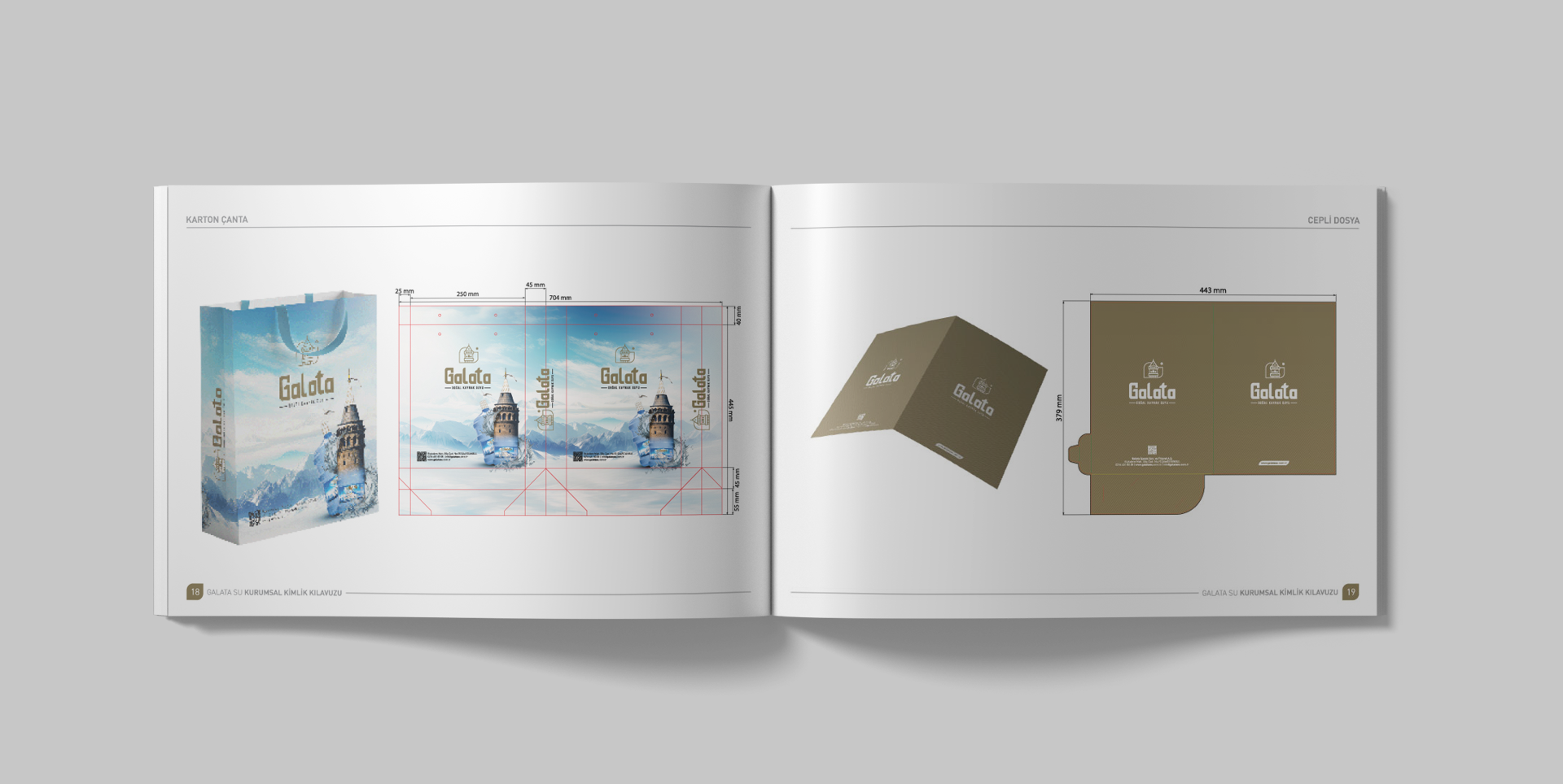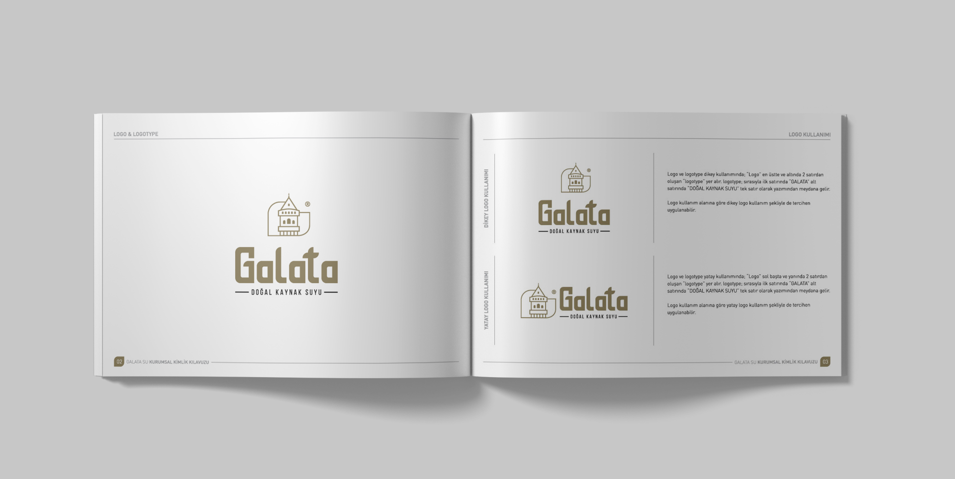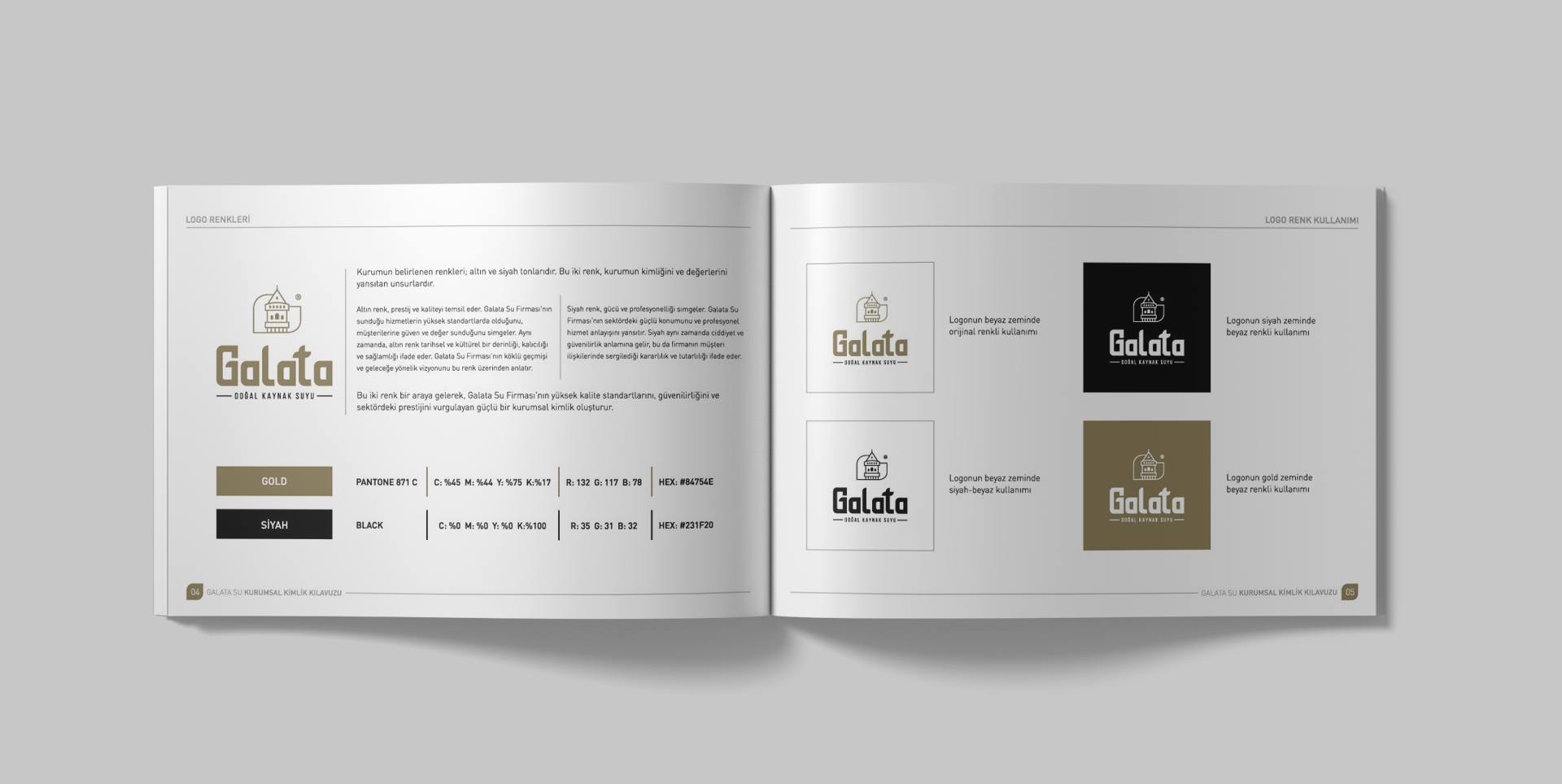 Galata Su markası için kapsamlı bir kurumsal kimlik kılavuzu oluşturuldu. Marka değerlerini ve premium algıyı yansıtacak şekilde logo tasarımı, renk paleti, tipografi, ambalaj tasarımı ve kurumsal materyaller (kartvizit, broşür, sosyal medya şablonları vb.) titizlikle hazırlandı. Lüks ve kaliteli bir görünüm sağlamak için gold ve siyah tercih edildi.